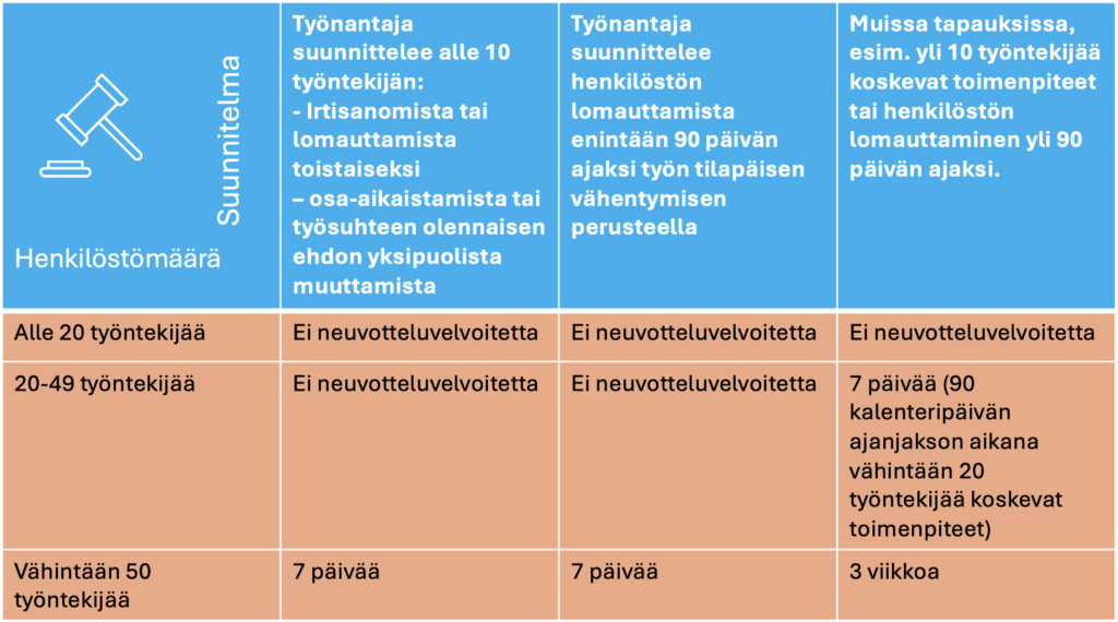 Muutosneuvotteluiden vähimmäisneuvotteluajat puolittuvat 1.7.2025 alkaen. Jatkossa neuvotteluajat ovat 7 päivää tai 3 viikkoa työntekijämäärästä ja työnantajan suunnittelemasta toimenpiteestä riippuen.